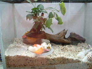 水槽、いい感じですね!砂が特に@@がとても好きそうな心地よさそうな具合に見えます。貝殻はねぇ、@ちゃんがいったい何を気に入るのか、なんでそれやね〜んって貝にはいったりしますからね。とにかくいろんなのを転がしておくしかないみたいです。あたらしい@@の到着がまちどおしいですね。