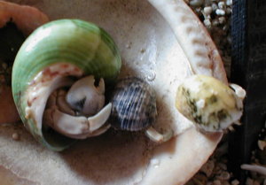 “のぼ”が去年11月に宿替えし写真の様な貝殻に入ったのですが、“のぼ”が脱いだ貝殻にすぐに入った子が右側の子です。“のぼ”より一回り体が小さい弟or妹みたいですが、どなたか良い名前を下さい。