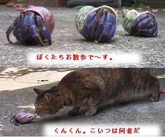 しんぱいですね。相変わらず裸ん坊のまんまでしょうか?裸の@ちゃんを貝に入れる方法が確か、あったと思うんです。靴の空き箱か何かに裸の@ちゃんと、入りそうな貝を入れて、そっとしておくとか、なんとかいうもの。こちらのページだったか、「ヤドカリ研究所」だったか忘れましたが。一度、試してみるのも手かもしれませんね。4月は、紫外線が強いですから、高温が原因でなければ、その辺りが関係している可能性も否定できませんね。サボテンなんかは、4月、5月、の日差しで日焼けして、ダメになることもありますから・・・。回復を祈ります。